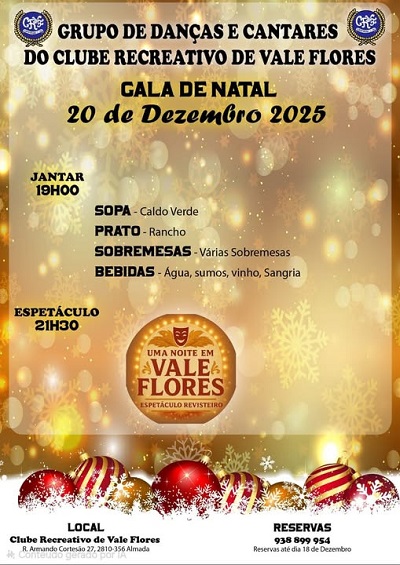 O Grupo de Danças e Cantares do Clube Recreativo de Vales Flores realiza uma Gala de Natal, no dia 20 de dezembro, que inclui um jantar às 19h00 e um espetáculo às 21h00, na sede do clube, sita na Rua Armando Cortesão. Resevas: 938899954.