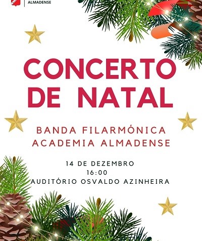 A Academia Almadense (AIRFA) realiza o Concerto de Natal da Banda Filarmónica Academia Almadense, dia 14 de dezembro, às 16h00, no Auditório Osvaldo Azinheira. Entrada livre.