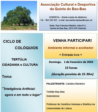 A Associação Cultural e Desportiva da Quinta do Bau-Bau vai realizar no dia 1 de fevereiro, domingo, 15 horas, um colóquio com o tema: "Inteligência Artificial: Agora e em todo o lugar". O orador é Carolino Monteiro, professor de Genética Humana e Bioética na Universidade de Lisboa. Entrada livre.