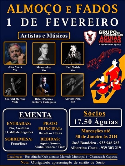 No dia 1 de fevereiro, a partir das 13 horas, o Grupo Concertinas Águias Vermelhas realiza um convívio com almoço e fados, na sua sede em Charneca da Caparica